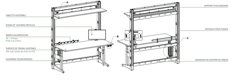 When we were approached by our client to design and build their state-of-the-art computer assembly posts, we were excited by the opportunity to showcase our expertise in tech-bench design and manufacturing processes. The project had specific requirements, including the need to accommodate 18 workstations, optimize the available space on their worksurfaces, a functional and ergonomic design for an IT-intensive environment, easy and quick access to CPU cables and LCD monitors in order to reduce interruptions, sturdiness to be able to withstand long working hours, a technological aesthetic to create an inspiring and comfortable working space, a modular design that allowed the capacity to add future accessories and components, and an installation with a lifetime warranty backed by the manufacturer.