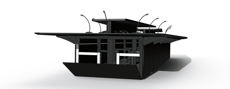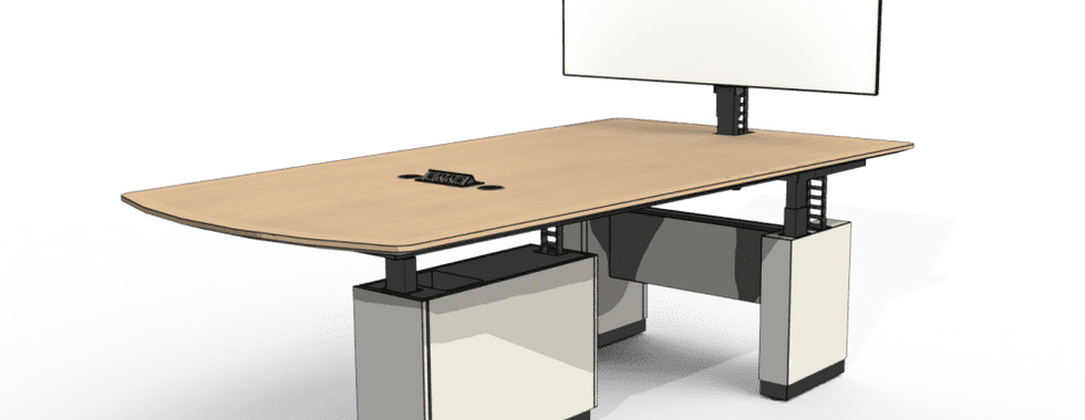 Sustema's boat-shaped technology tables redefine the modern conference room by providing an interactive and collaborative work environment. Modern conference table with data ports and power are designed to combine technology with the furniture functionalities to create a multidisciplinary work area. Every table is uniquely built to meet the business needs of our customers, in this example. Sustema's high-end technology conference tables are built from a heavy-duty steel structure to accommodate all the IT equipment. Actuators lift the work surfaces up/down and includes collision protection sensors to eliminate the risk of accidents. The large interior area serves as a cable management system running power and data cables through the vertical posts. Learn more about Sustema's 12+ person conference table.
